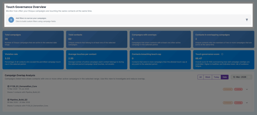 The Touch Governance section provides analytical insights into communication governance, audience exposure, and overlap behavior across all campaign types, including Draft and Completed campaigns.