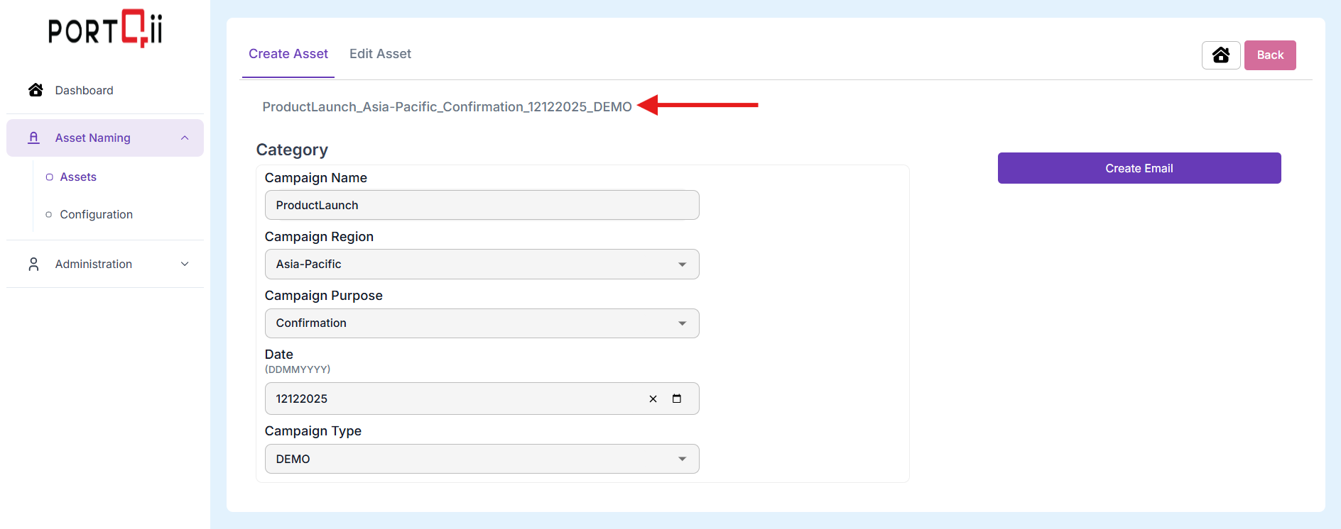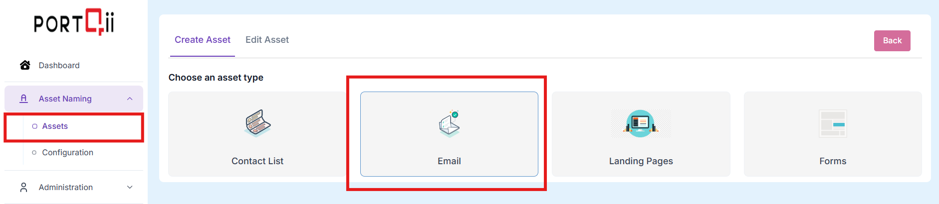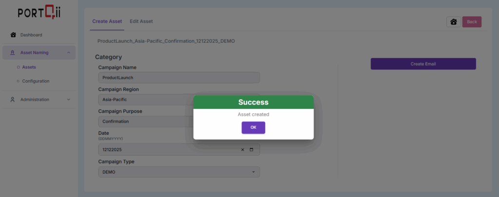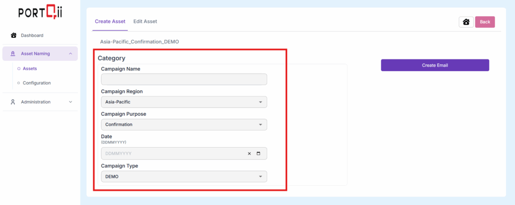 The logged-in Home-Page has Assets option under Asset Naming. Click on Assets option. To create an asset, we need to first choose the asset type that needs creation. In this case, we will choose Emails.