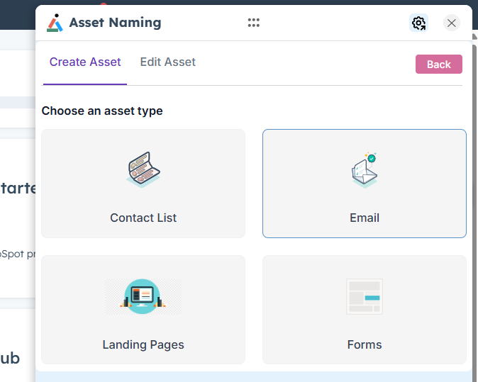 3. Choose an Asset Type from the available options — Contact List, Email, Landing Page, or Form.