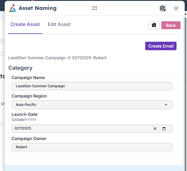 5. Click Create to generate the asset. A Success message will confirm that the asset has been created successfully.