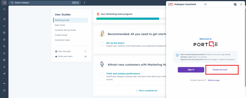 2. Open the floating Portqii (Audienz) icon inside the Hubspot application. You will be prompted to either Sign In or Create a New Account.