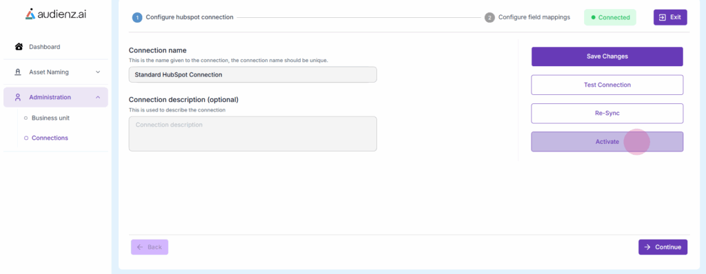 8. After authorization, the user will automatically be redirected back to the Audienz.ai application. Once the connection is established, click the Activate button to finalize and enable the connection.