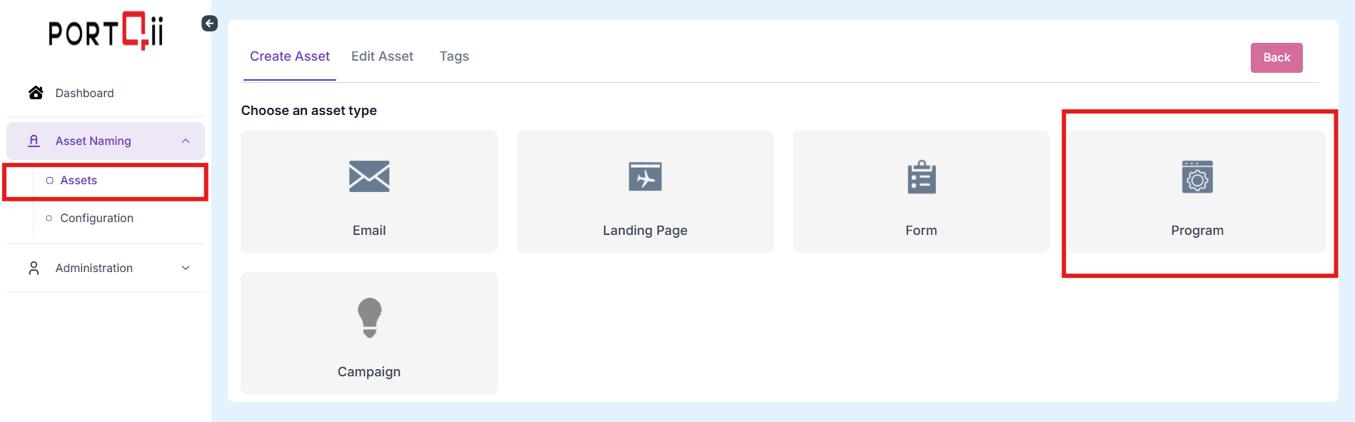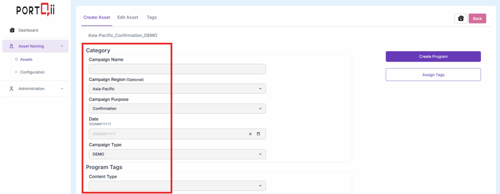 The logged-in Home-Page has Assets option under Asset Naming. Click on Assets option. To create an asset, we need to first choose the asset type that needs creation. In this case, we will choose Programs