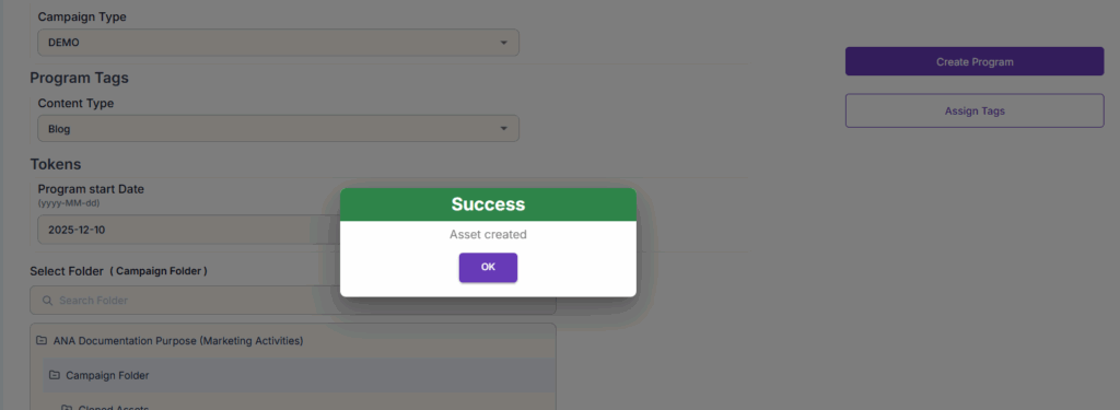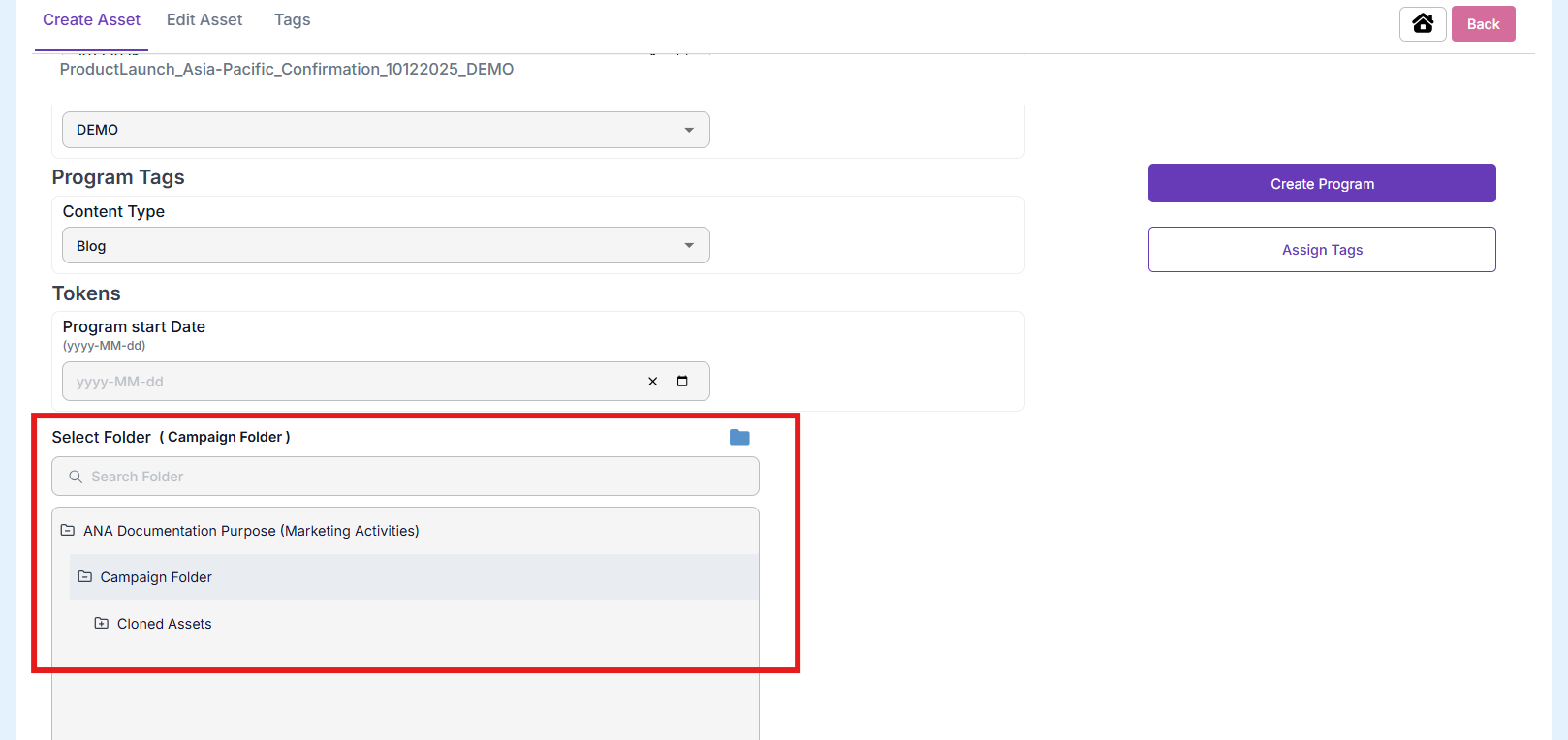 Once the form is filled, we need to tell ANA the folder in which we need the asset. We choose the folder and click on the Choose Program button.