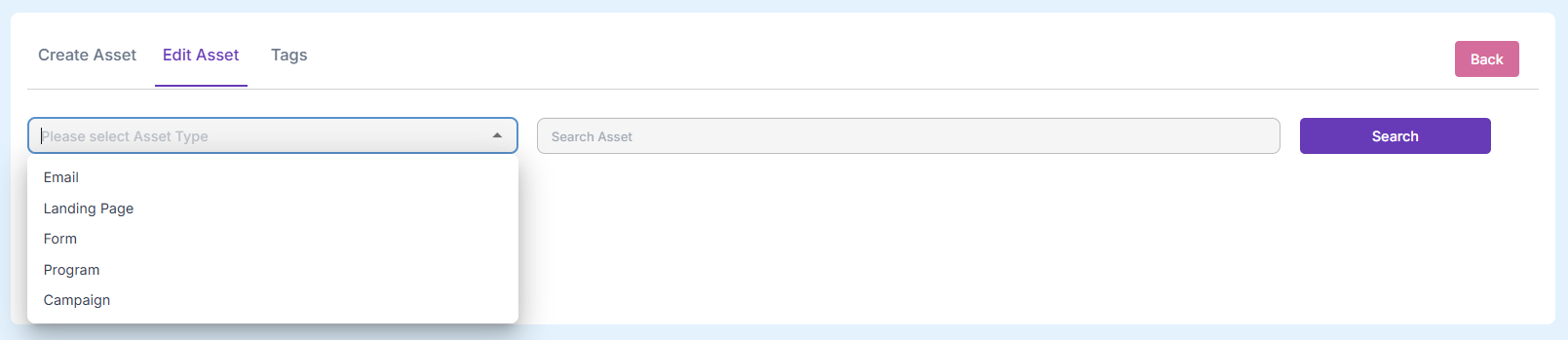 Step 1: Choose the Asset Type from the Dropdown list: