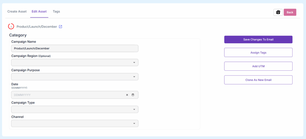 To rename any assets, click on Any asset from Homepage to edit or click on Create/Edit Asset button from Homepage and Click on Edit Asset tab.