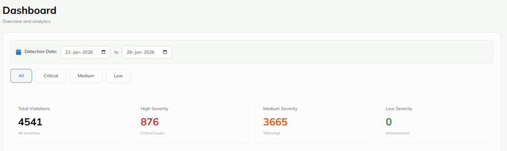 Note that Violations can be filtered using a Detection Date range, allowing administrators to focus analysis on specific time periods in the Dashboard page.