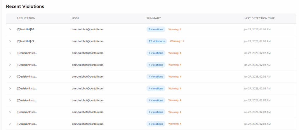 Below the metric cards, the Dashboard displays a violations table that presents detailed contextual information for each detected event. For every violation entry, the table identifies the application from which the violation originated, the user responsible for the activity, the total number of violations associated with that user, and the most recent date and time when a violation was detected. This structured view allows administrators to quickly correlate users, applications, and violation frequency.