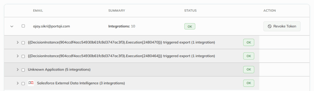Users are presented in a tabular view that consolidates identity, activity summary, and compliance status into a single, scannable format. Each entry represents an integration user and provides administrators with immediate visibility into whether the user’s activity is considered acceptable or critical. The table also includes an administrative action that allows access revocation when necessary.