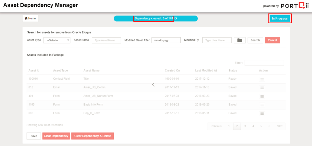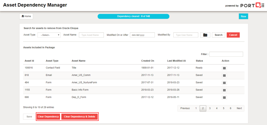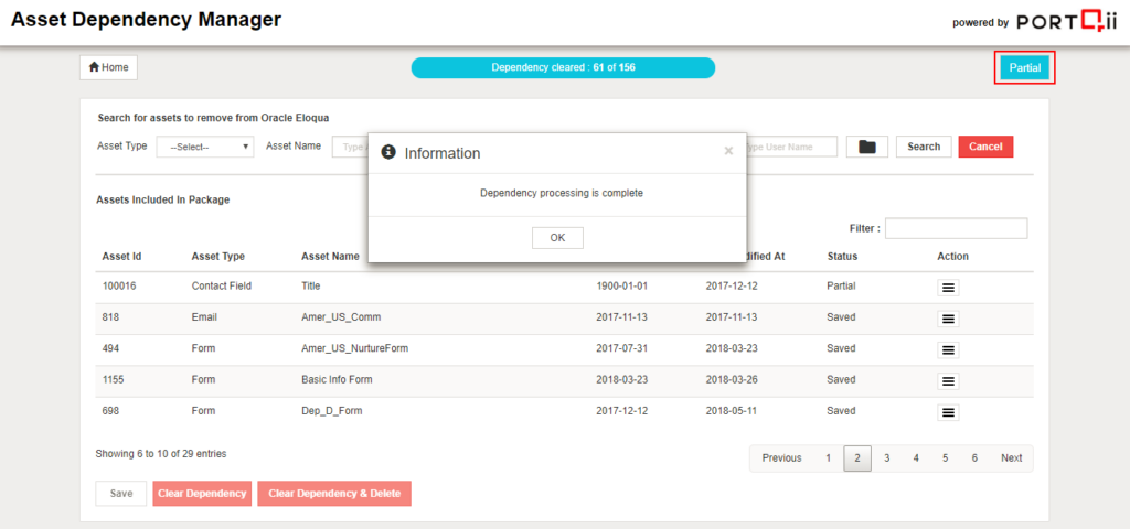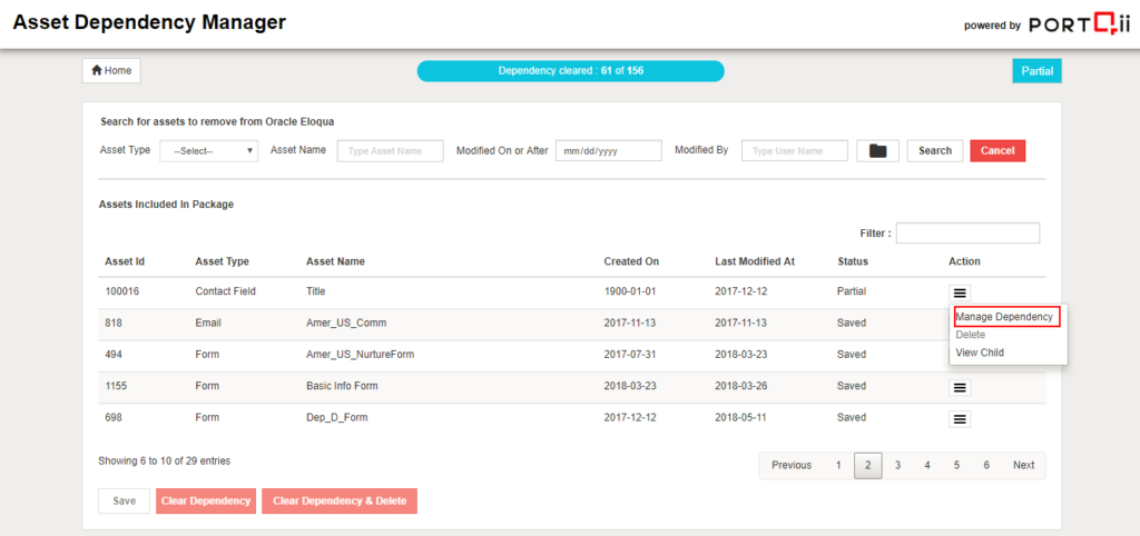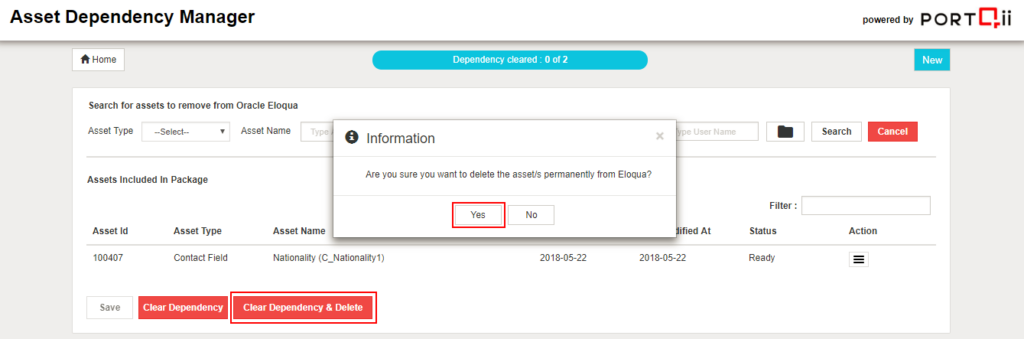 The process of clearing dependencies is to initiate the process of performing the actions defined in Manage Dependencies and also provide an option to delete the asset from Eloqua. Two options have been provided to the user.