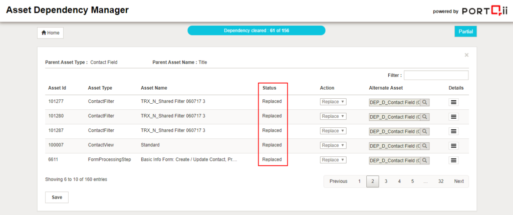 Once the package has finished processing the status of the package will be changed from In Progress to one of the post processing statuses. Refer to the link to understand package status. Current execution status of clear dependency is also shown in the package that gives the number of dependencies being removed/replaced Vs. total count of dependent assets.