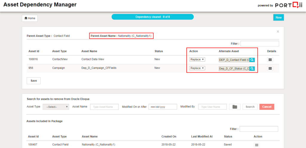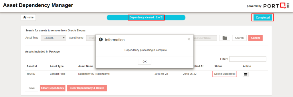 Create the package by adding contact field ‘Nationality’. Click on Manage Dependency to assign action to remove/replace dependency. Click on ‘Clear Dependency & Delete’ button to clear dependency and then delete the asset from Eloqua.