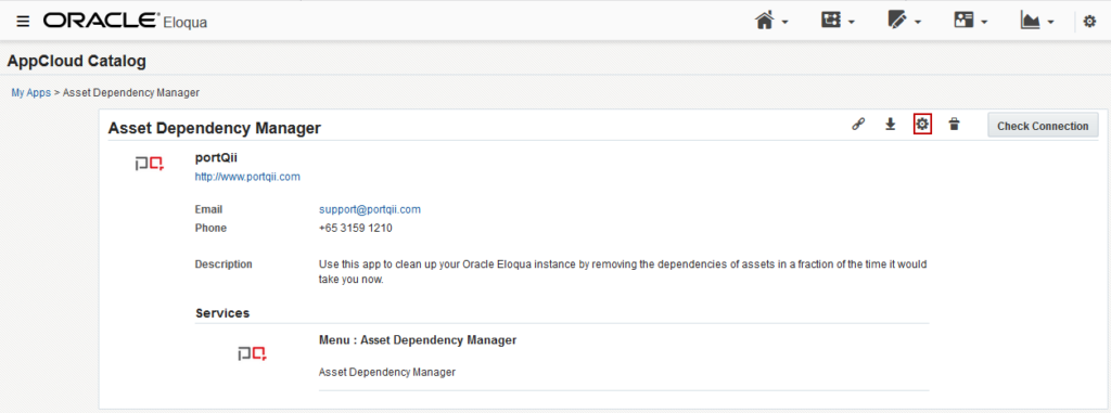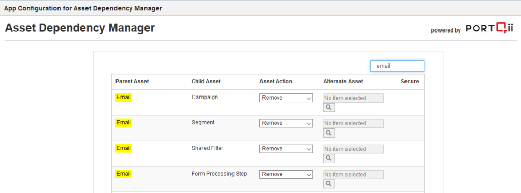 ‘Manage & Clear’ will apply the actions and alternate assets from default settings and will clear all the dependencies. This process will not delete the asset whose dependencies are being removed, from Eloqua. Whereas ‘Manage & Delete’ will do the above and also delete the asset whose dependencies are being removed, from Eloqua. The actions and the alternate assets for managing and clearing the dependencies will be picked up from the default settings in the admin page of the app.