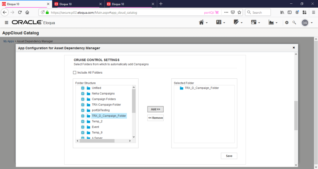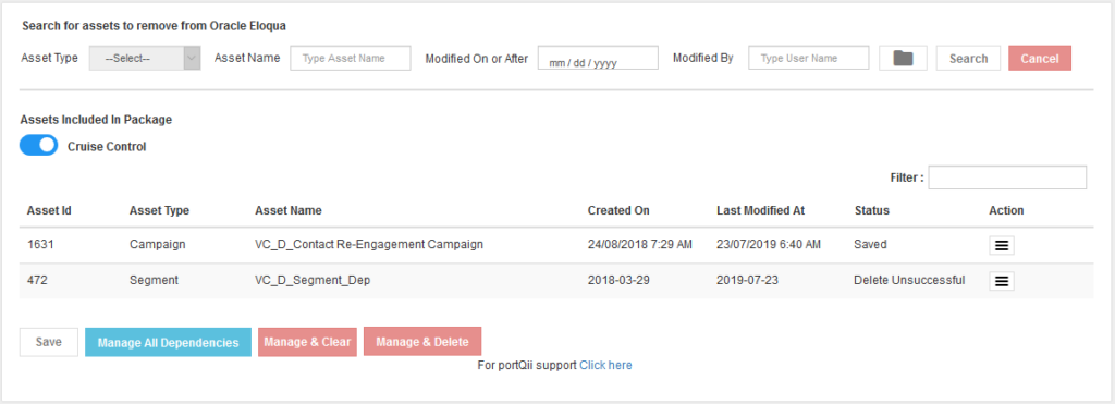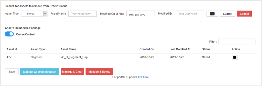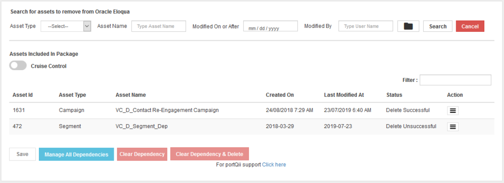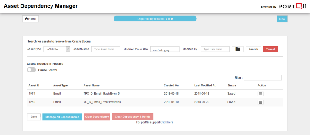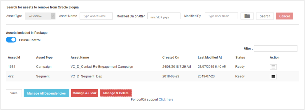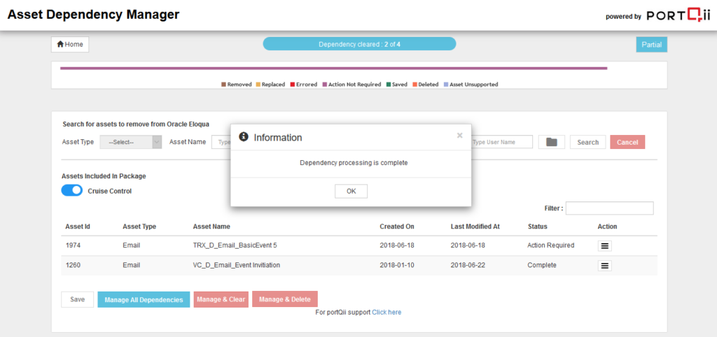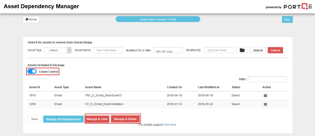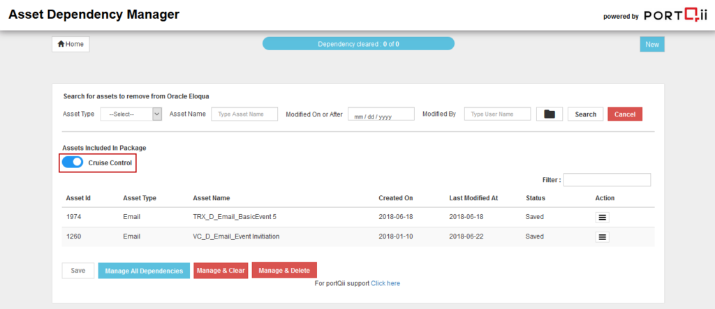 If the User is 100% sure that the actions and alternate assets for dependency management and removal can be from the default settings in the admin page, and doesn’t want to go through the Manage Dependency process, then the User can go for Cruise Control option. Cruise Control is a single click Dependency Management and Clearing process that applies actions from admin page and removes the dependencies. Cruise Control is very powerful and fully automated process of Dependency Management where the User just adds the asset whose dependencies have to be removed and takes a decision whether to only clear the asset’s dependencies or clear it’s dependencies along with deletion of the asset from Eloqua.