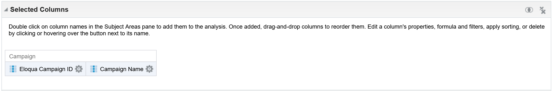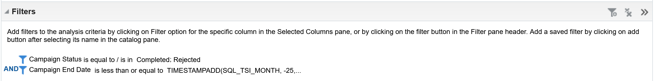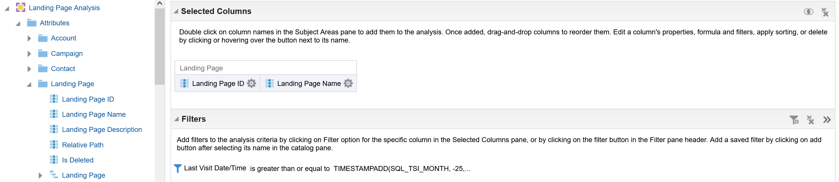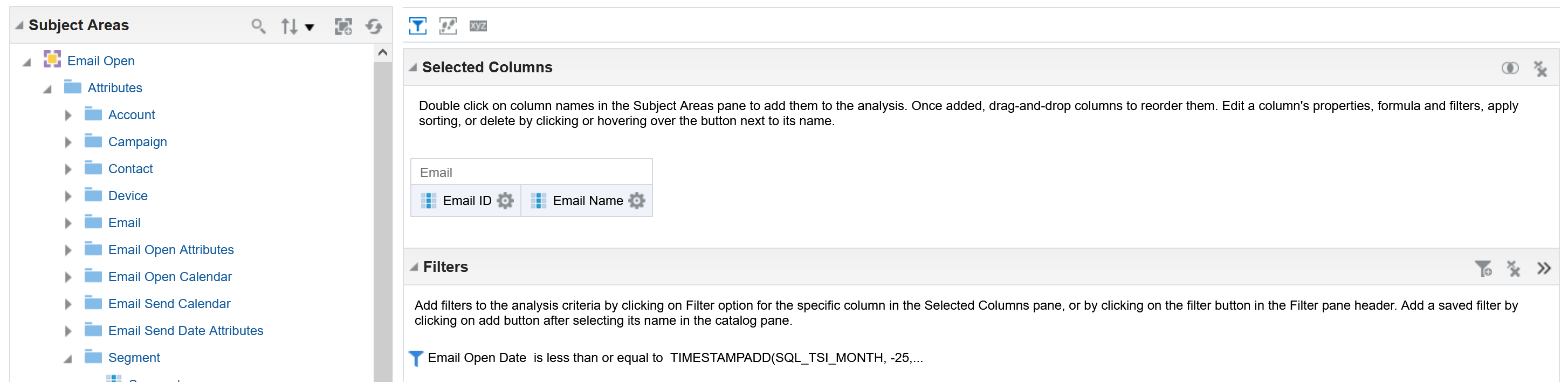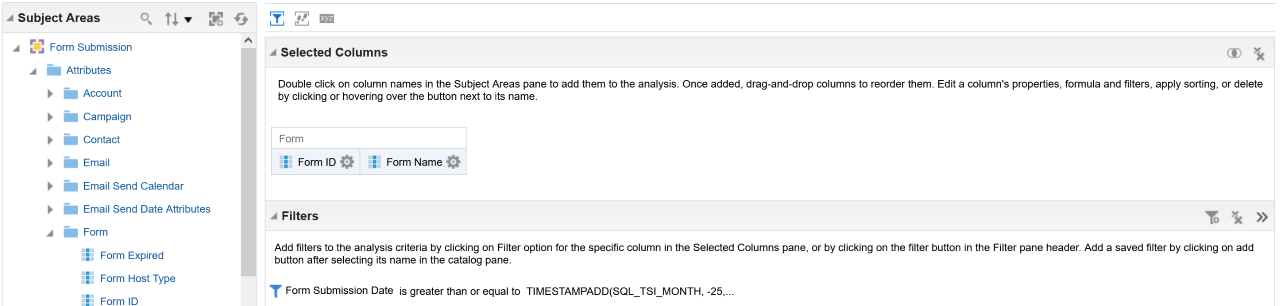 | How To Execute a Campaign Analysis report ensuring that the Eloqua Campaign ID and Campaign Name are exported from Insight. Use the CSV export to create packages within Asset Dependency Manager. Refer to the following images: Screenshot 1: ![]() Screenshot 2: ![]() Enter the following Expression in the Expression text box: TIMESTAMPADD(SQL_TSI_MONTH, -25, CURRENT_DATE) |