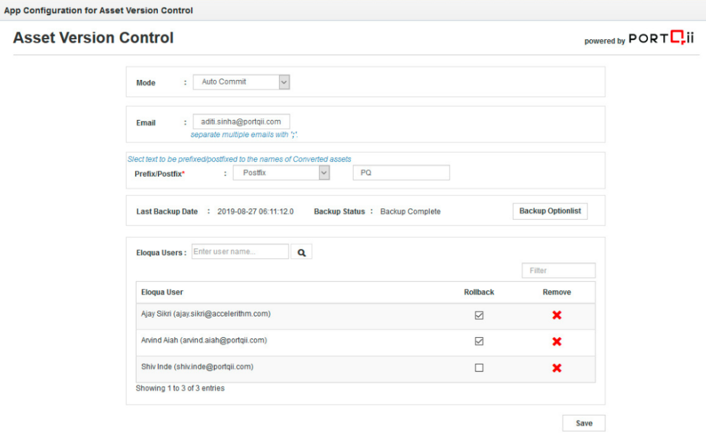 Since Eloqua doesn’t support creating or updating the Emails and Landing Pages with Classic Design Editors anymore, the app creates a HTML Email or Landing Page when a Design Email or Landing Page is rolled back. Since a new Email or Landing Page is created (than updating the same asset), the naming convention requires the user to set-up a prefix or postfix. For example Consider an Email ‘Thank You for Registering’ to be a Design Email. The admin setting has Postfix with a value ‘PQ Converted’. If any version of this Email is rolled back, then a new HTML Email will be created with the name ‘Thank You for Registering PQ Converted’.
