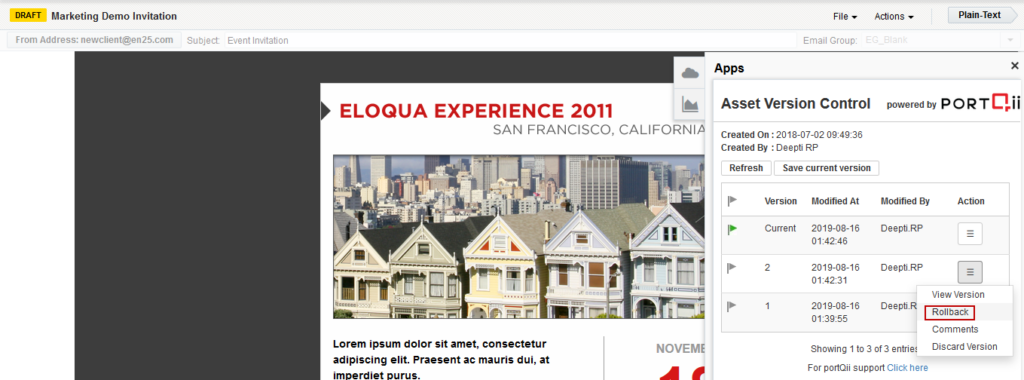 Click Rollback on the version you would like to recover. This will recover the deleted asset. The limitation here is, if one or more child assets are deleted from Eloqua, then the asset cannot be recovered.