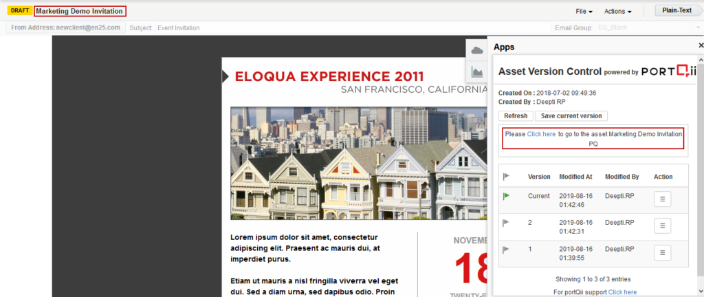 Launching the application when viewing an asset (Email, Landing Page, Form, Campaign, or Program) will display all the previous versions tracked for that asset.