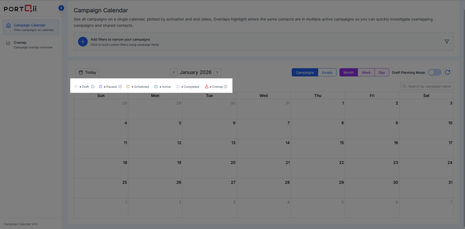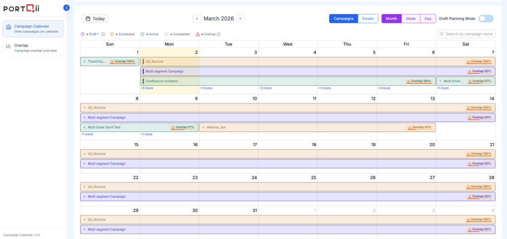 When any two campaigns share common contacts—regardless of their status—both campaigns appear across their overlapping date ranges. This helps you identify potential audience fatigue or conflicting messaging.