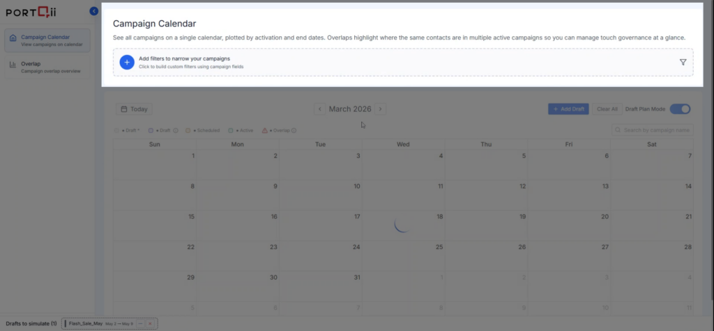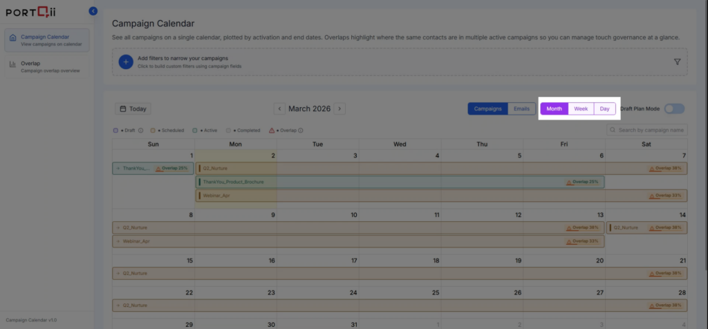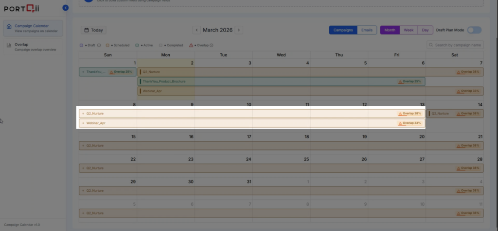 Calendar View gives you a unified visual timeline of all campaigns connected from Eloqua. See Active, Scheduled, Draft, and Completed campaigns at a glance to assess audience touch frequency and prevent overlaps before they happen.