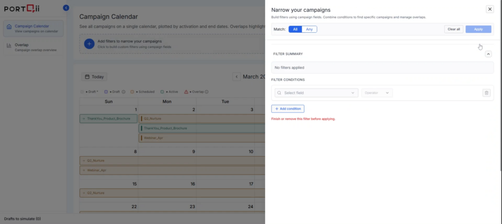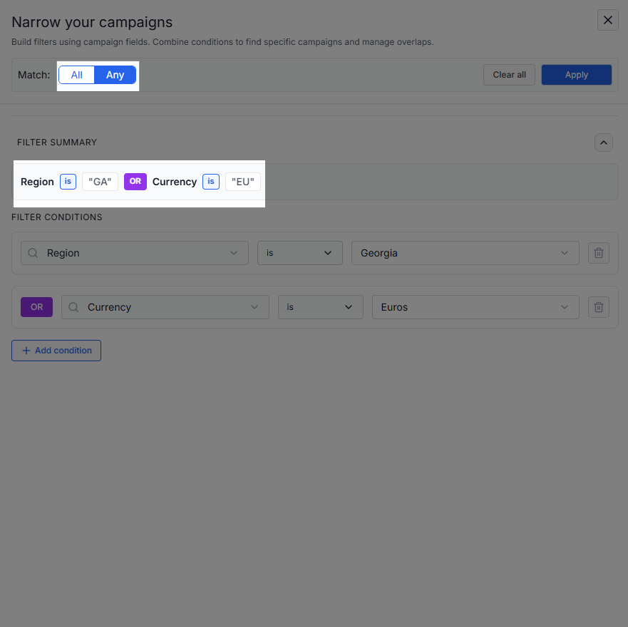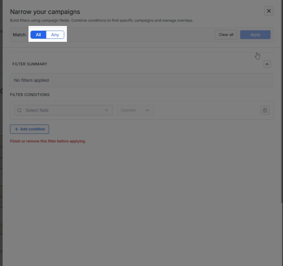 Filter campaigns by specific attributes to focus on what matters most. Build dynamic filters using campaign fields and logical conditions to narrow your view.