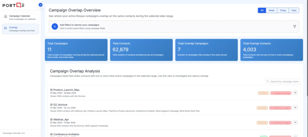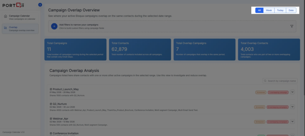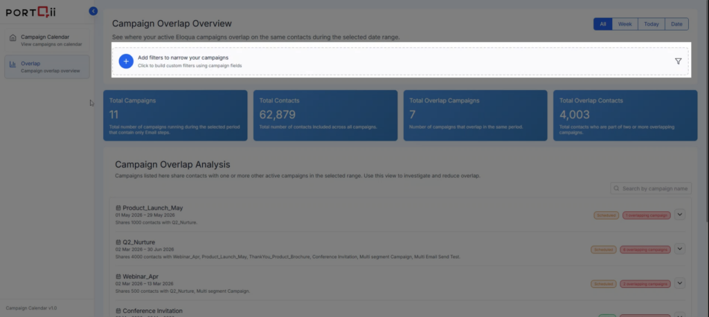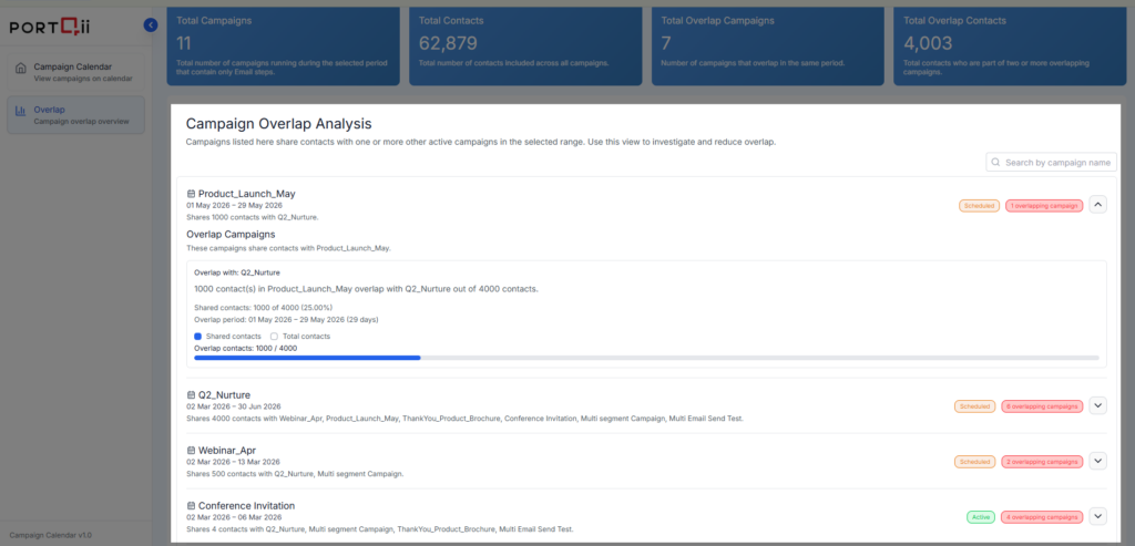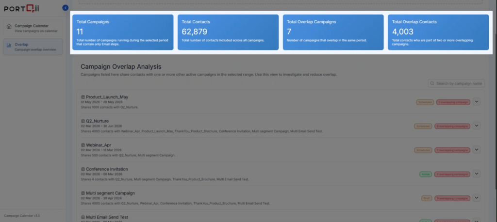 The Campaign Overlap Overview shows you which campaigns are running simultaneously and targeting the same contacts within your selected date range. This view includes both Active and Scheduled campaigns to give you complete visibility into potential overlap issues.