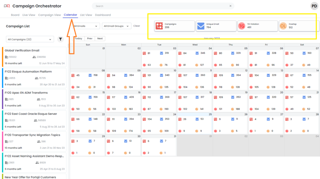 The calendar view displays daily metrics for an entire month, giving you a high-level overview of your email marketing activity.
