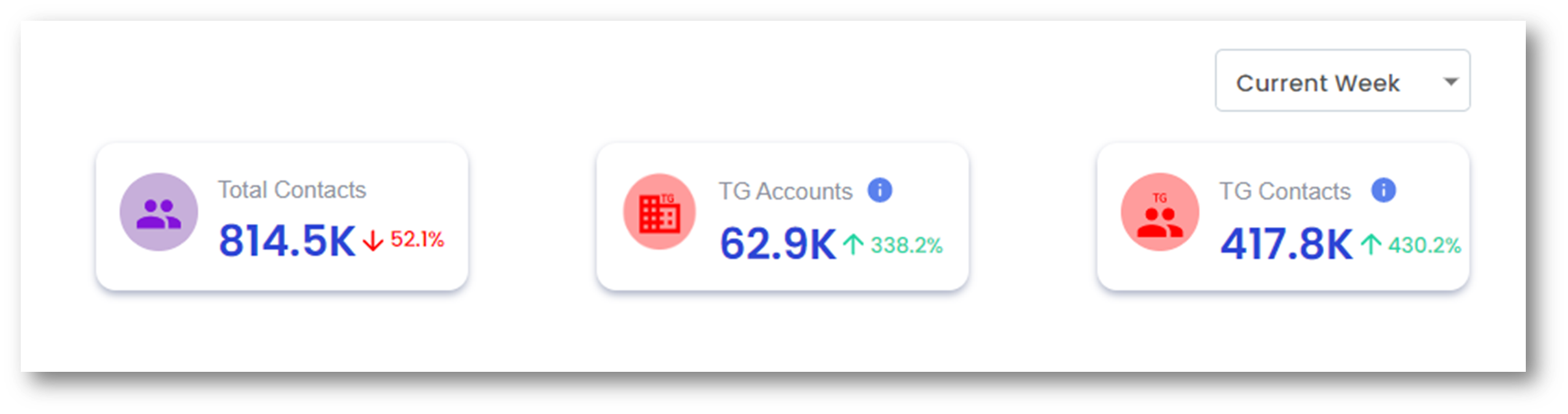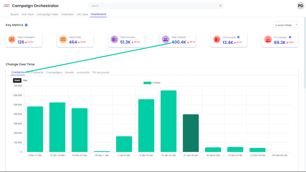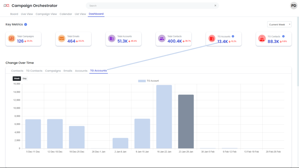 Total Contacts: Number of contacts that will receive emails in the week TG Accounts: Number of accounts for which TG rules were violated TG Contacts: Number of contacts for which TG rules were violated |