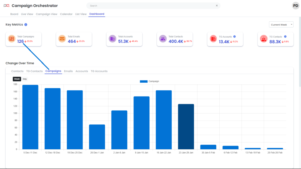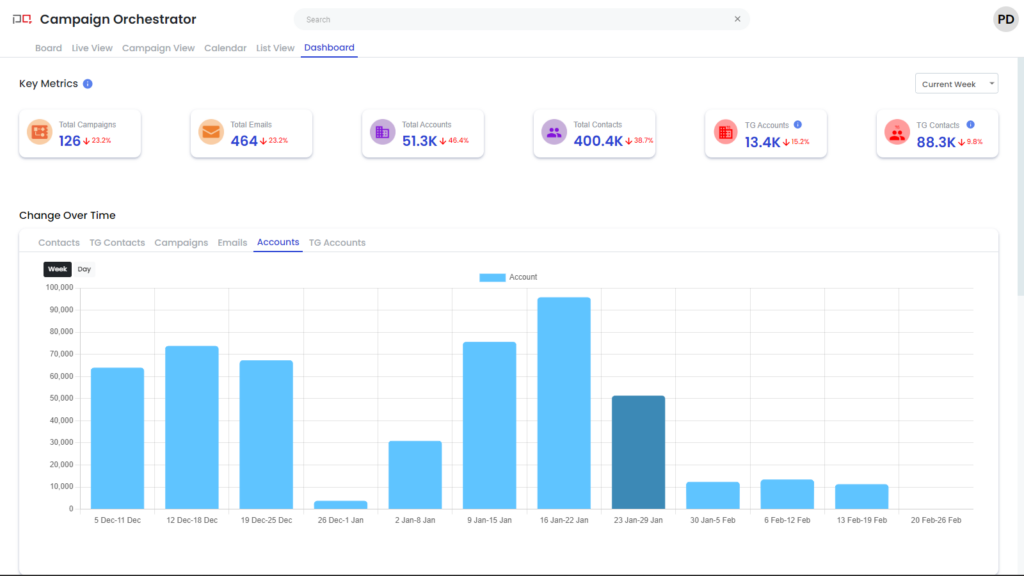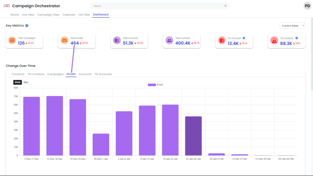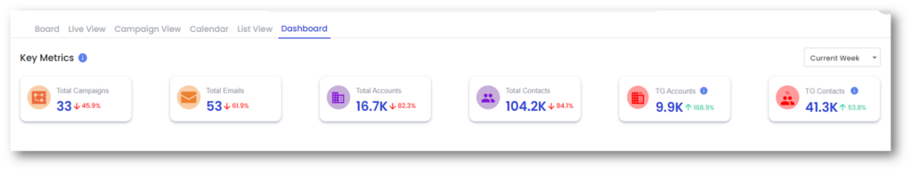 Total Campaigns: Number of campaigns sending email in the current week Total Emails: Number of unique Eloqua emails involved in the total sends Total Accounts: Number of accounts that will receive emails in the week |
