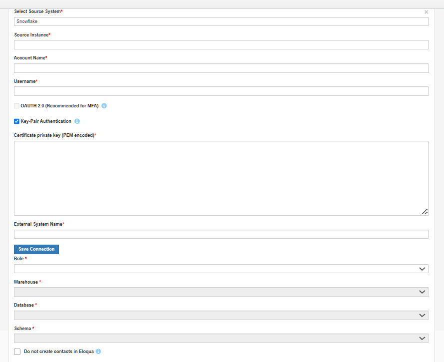- External System Name: Specify the name that will identify this Snowflake instance in the Segmentation user interface.