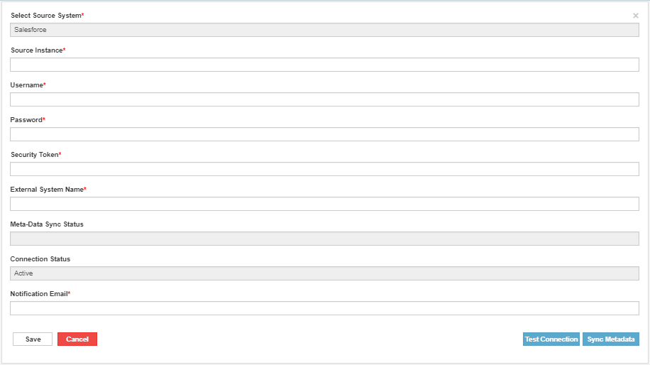 - Source instance: Choose between one of the following values depending on the type of Salesforce instance you are connecting to: Production, Sandbox, Dev