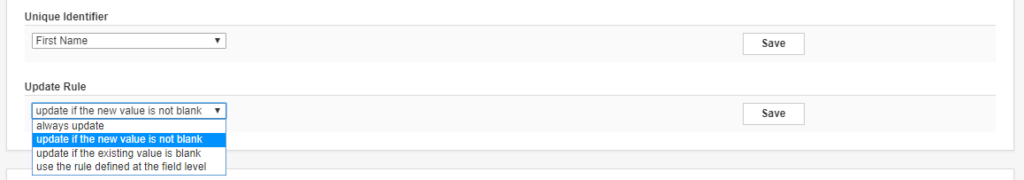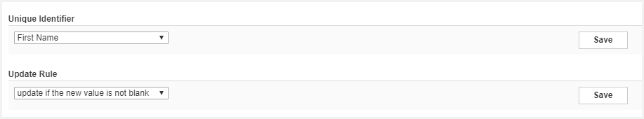 - Choose the Unique Identifier field and Update Rule that has to be applied during file import. Users can choose to select any mapped field as Unique Identifier and choose an action from Update Rule dropdown.