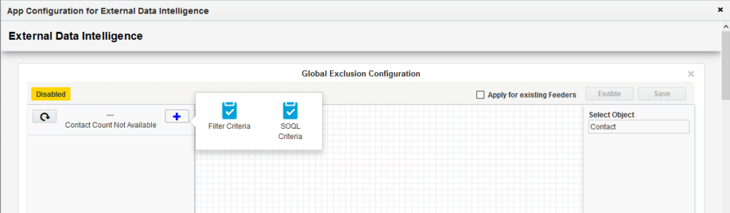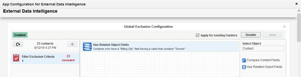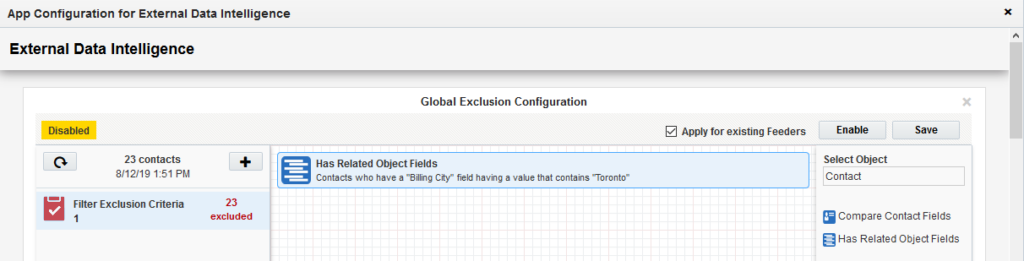 - Click on Enable to apply Global Exclusion Criteria to the New Segments. Click on Apply for Existing Feeders to apply Exclusion Criteria to all Existing and New feeders. This will exclude the contacts to be imported into Eloqua.