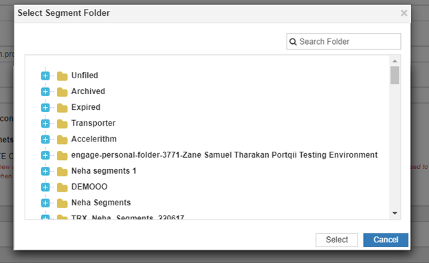- Admin can select the folder by clicking on the edit icon on the right side, on click of edit one popup will open showing the folder list user need to select the folder, selected folder will be used for store created segments.