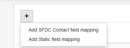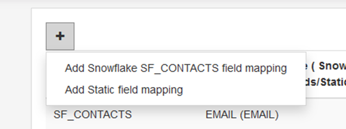 - Clicking on the + symbol will give you the option to add either SFDC fields (Snowflake fields for Snowflake connection) or Static fields. Choose ‘Add static field mapping ‘.