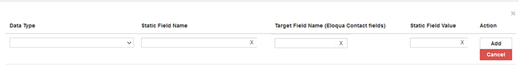 - From the screen below, choose the data type of the field (Supported data types: Text, Numeric), give a label to the static field, choose the Target field from all Eloqua Contact fields dropdown, and then enter desired Static field value. Now you are set to add the static field to your field mappings.