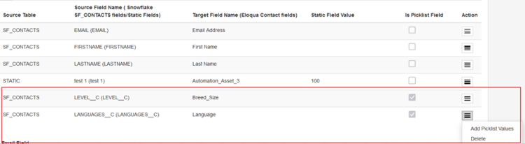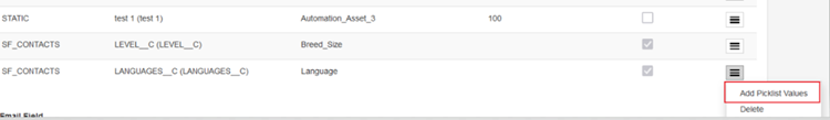- After configuring the Picklist field mapping, click the Menu icon to add picklist values.