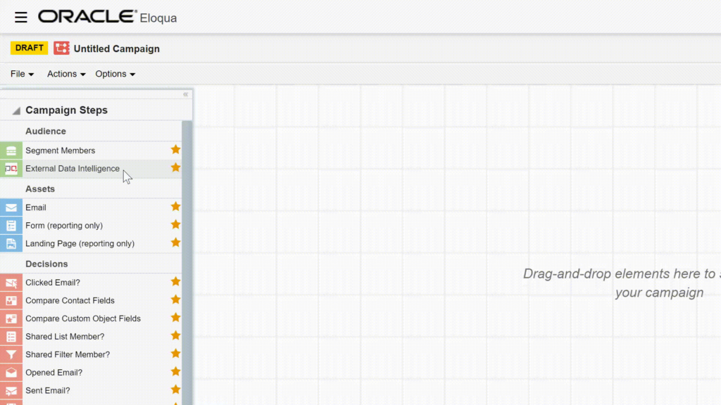 - Add the External Data Intelligence audience component from the Campaign Steps pane. By default, popular elements are shown. To view all the available elements, click the Campaign Steps heading. You can mark your own favorite elements by clicking the star icon.