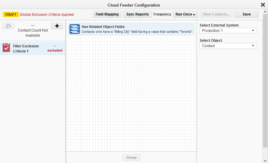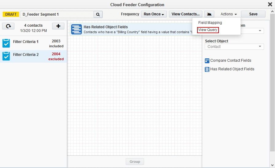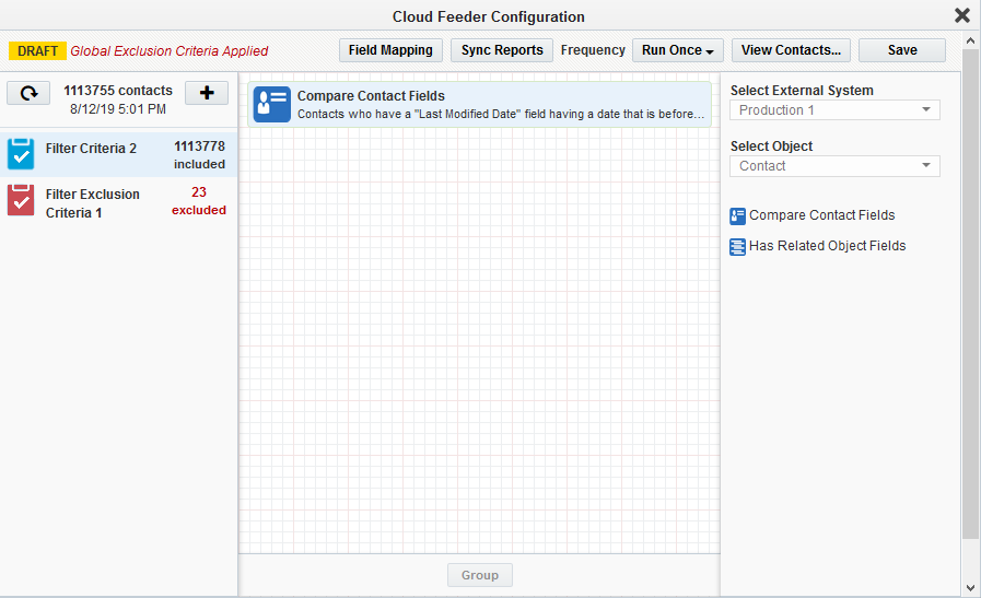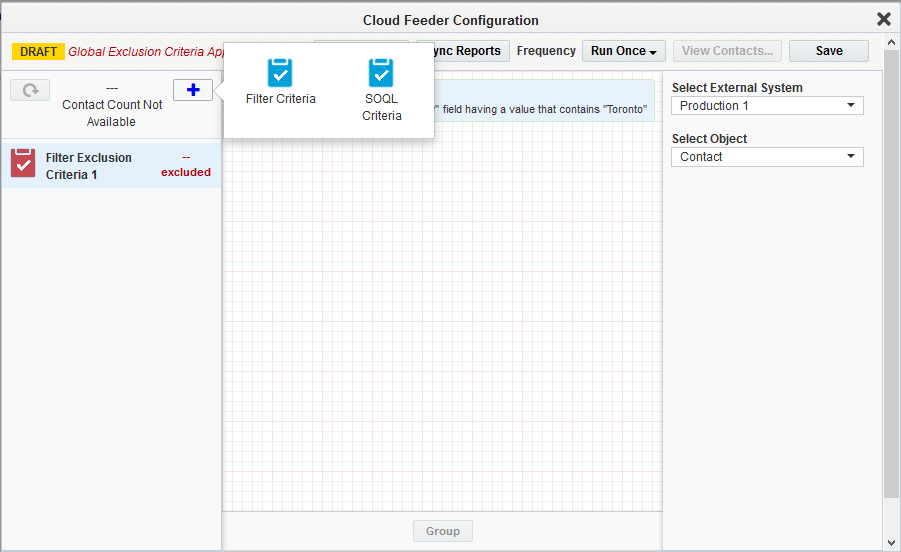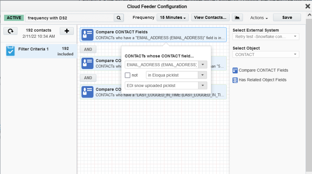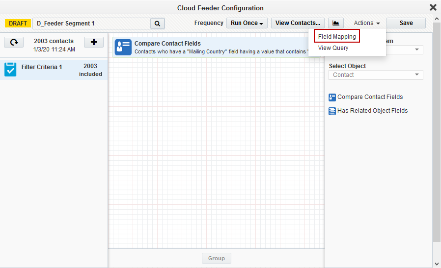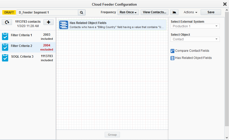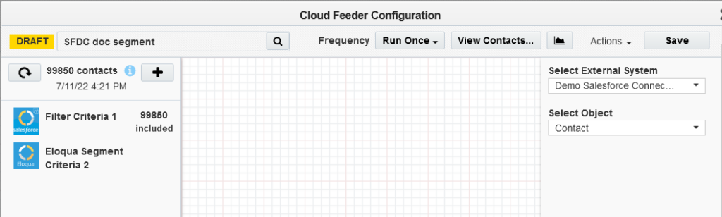 Note: The contact-count visible on the feeder after the save is the count resulting only from the salesforce query. The actual contact count will be shown once the process of combining the EDI filter criteria with Eloqua segment happens (after the campaign activation on Sync reports).