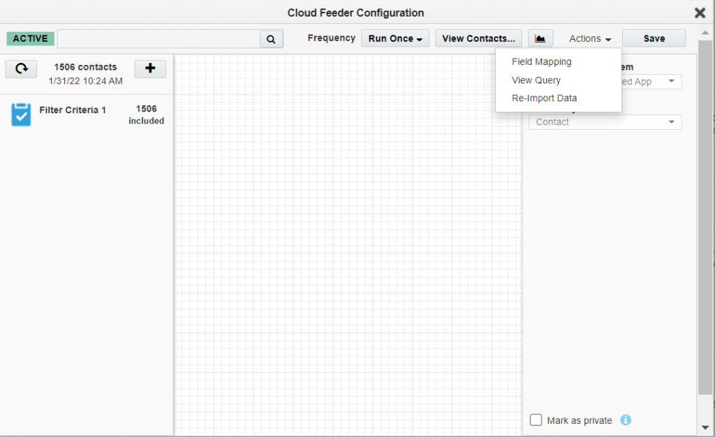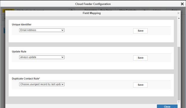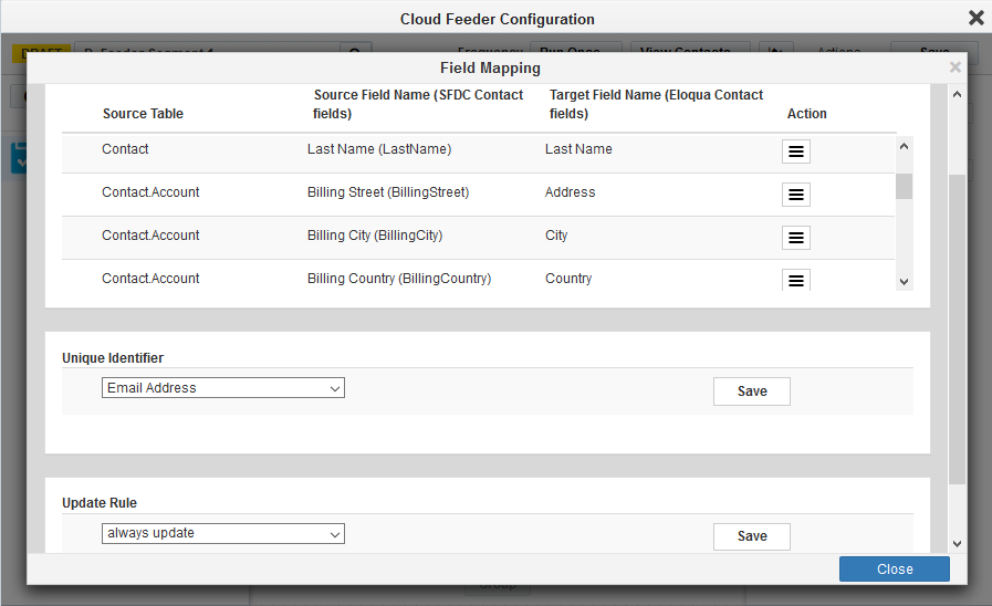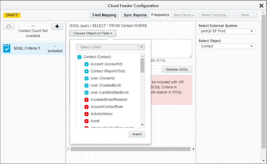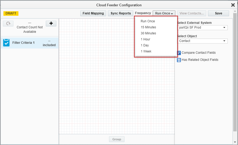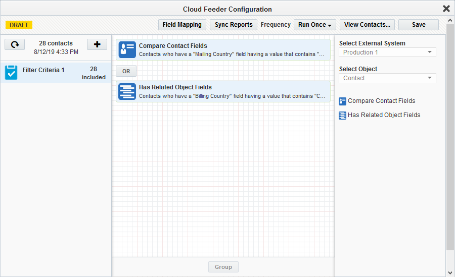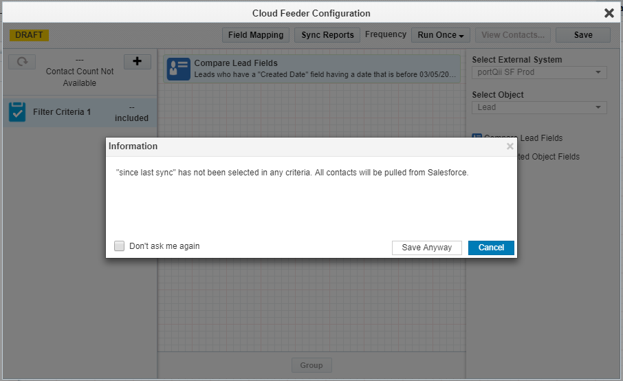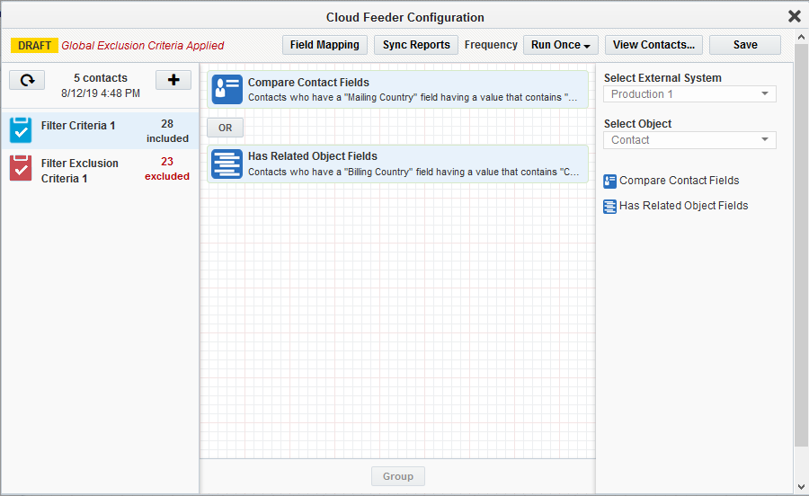 Note: The contact-count visible on the feeder after the save is the count resulting only from the salesforce query. The actual contact count will be shown once the process of combining the EDI filter criteria with Eloqua segment happens (after the campaign activation on Sync reports).