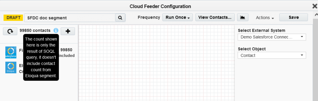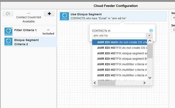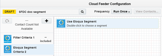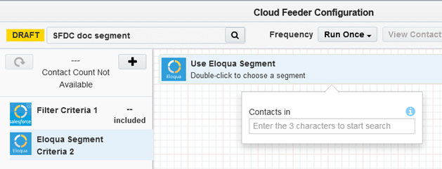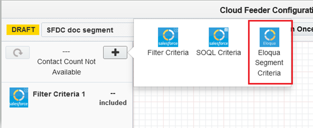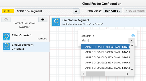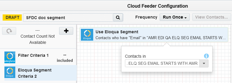- The contact count visible to the user is the count resulting from the salesforce query only, it cannot show the combined result of salesforce and Eloqua segment contact count.