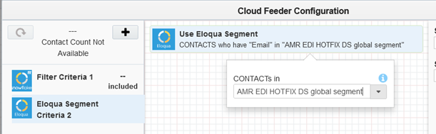 - The Eloqua segment which will be used in EDI can contain Filter criteria and Shared filters. Other filter options like Individual Contacts, Shared Lists, Upload Contact are not supported. Segments with no filter criteria are also not supported.