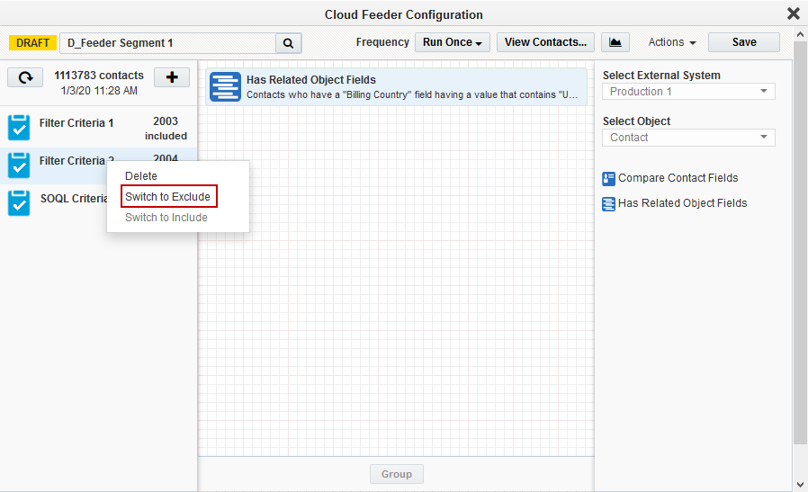 - Filter Criteria or SOQL Criteria can be switched to exclude/include. This will exclude/include the contacts from that criteria to be imported into Eloqua. Click Save once you have completed building the segment.
