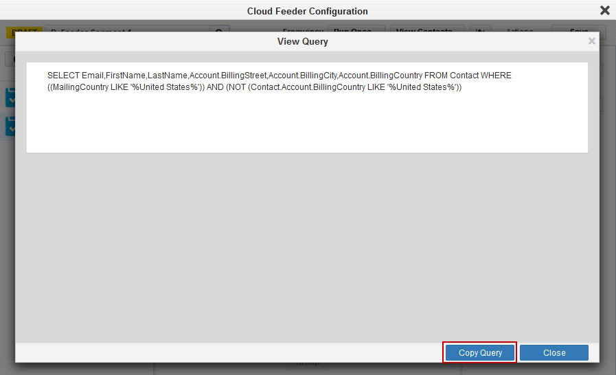 - Once the Feeder Segment is built, you can get the overall query using the ‘View Query’ feature. Clicking on ‘Copy Query’ button copies the query where you can paste it on the Salesforce Workbench to check the query results.