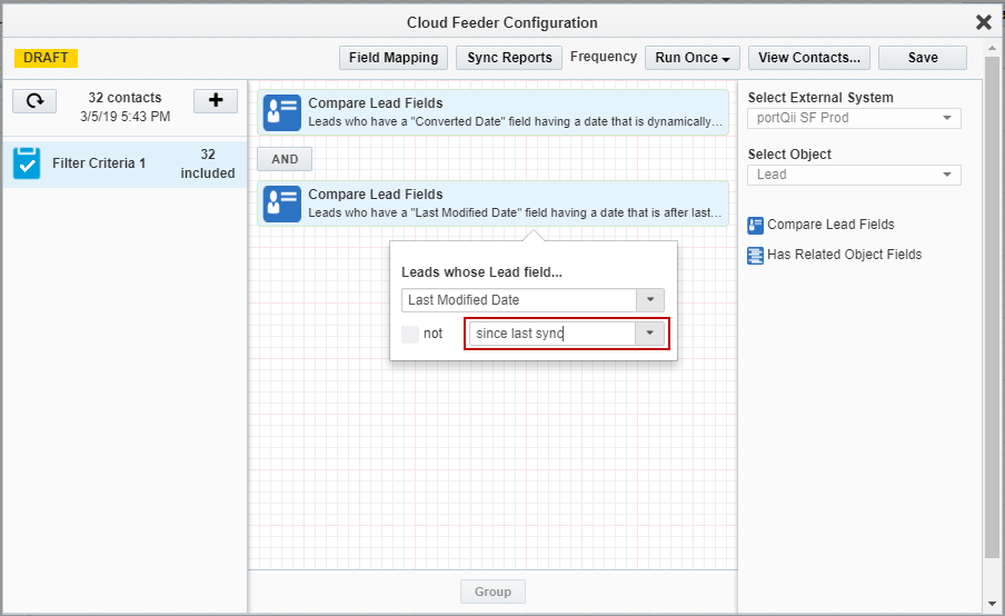 - Double-click the criteria you added to configure it. Select any ‘Date’ field and click on the ‘Operator’ drop down to select ‘Since Last Sync’.