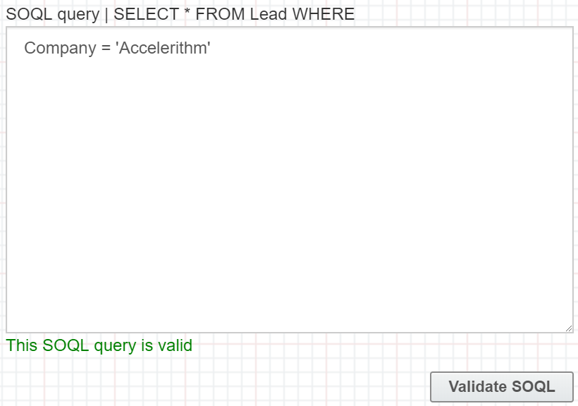 - Click Validate SOQL. If a valid SOQL statement was inputted, then the following message will be displayed.