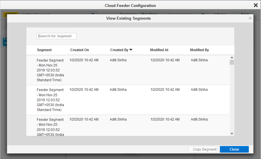 - Click on to View Existing Segments. All the Segments are listed.