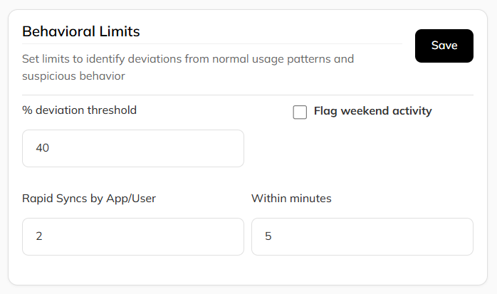 Behavioral limits detect abnormal usage patterns. You can configure rules for: