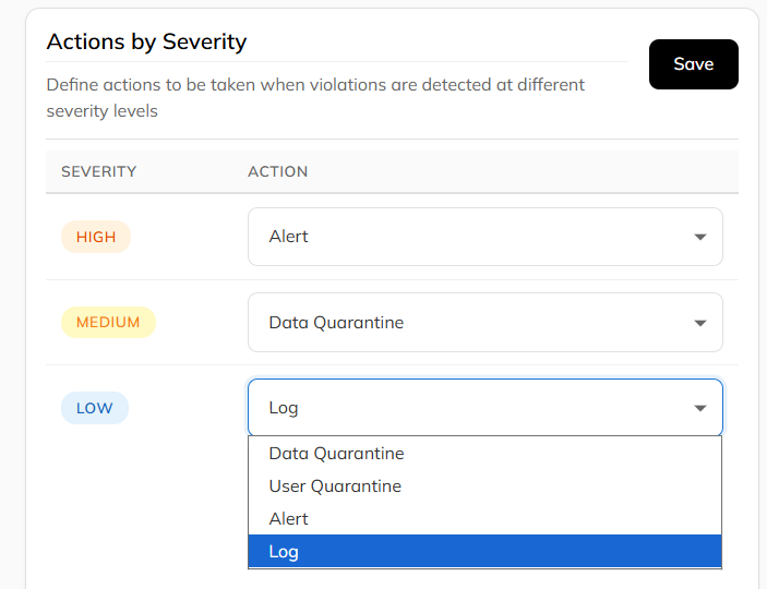 This section defines automated responses for Low, Medium, and High severity violations. You can configure these actions: