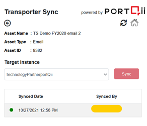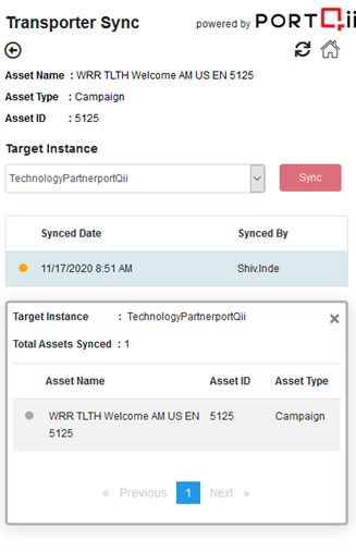 - To see complete details on any recent sync item, click it. This opens a details page with the asset name, type, source asset ID, target instance, sync date and time, and who performed the sync.